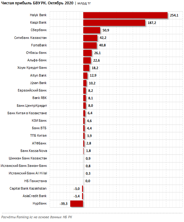 Больше всех заработал Halyk Bank — 254,1 млрд тенге за январь-октябрь 2020 года (38% в банковском секторе). За ним следует Kaspi Bank с 187,2 млрд тенге. На третьем месте Сбербанк – 50,9 млрд тенге.