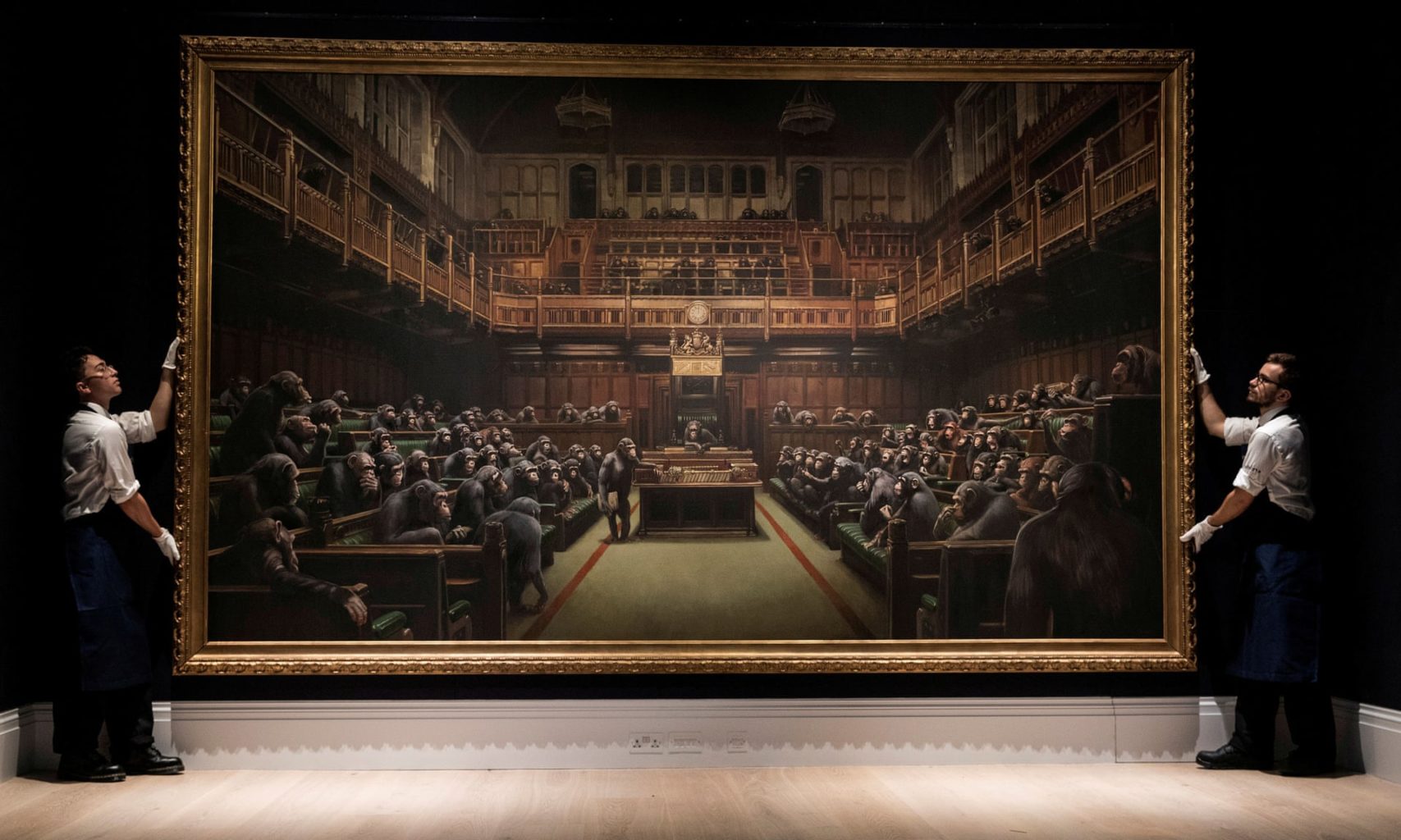 Эта картина самого популярного уличного художника в мире, которого никто никогда не видел (Бэнкси скрывает свою личность), изображает заседание нижней палаты британского парламента. Только вместо депутатов там собрались шимпанзе. Так, автор намекает на деградацию британских политиков.