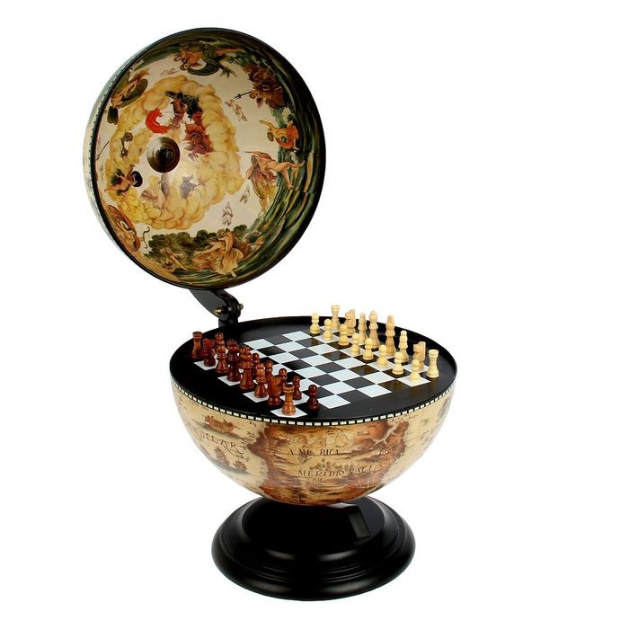 Такой глобус можно назвать мечтой каждого романтика и любителя путешествий. Взгляните на его карту: перед нами предстает мир - такой, каким его видели Магеллан и Колумб. Однако это не единственная особенность этого замечательного глобуса: открываясь, он являет нам шахматную доску. Под доской располагается отделение для фигур, каждой из которых предназначена отдельная ячейка. Этот глобус будет прекрасно смотреться как в гостиной, так и в рабочем кабинете.