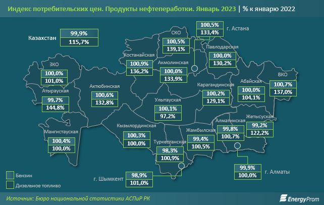 Как выяснили аналитики EnergyProm, сильнее всего рост цен на дизельное топливо ударил по кошелькам жителей Атырауской области: здесь удорожание составило сразу 44,8% за год. Заметно выросли также цены в Северо-Казахстанской (плюс 39,1%) и Восточно-Казахстанской (плюс 37%) областях. В Мангистауской и Кызылординской областях, а также в Алматы цены остались на уровне прошлого года. В Улытауской области дизтопливо подешевело на 2,8%.