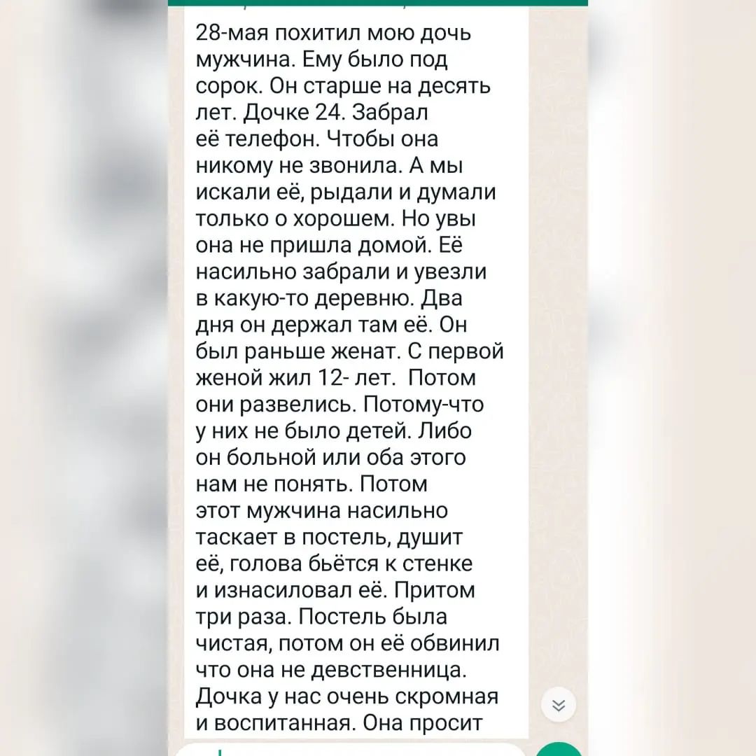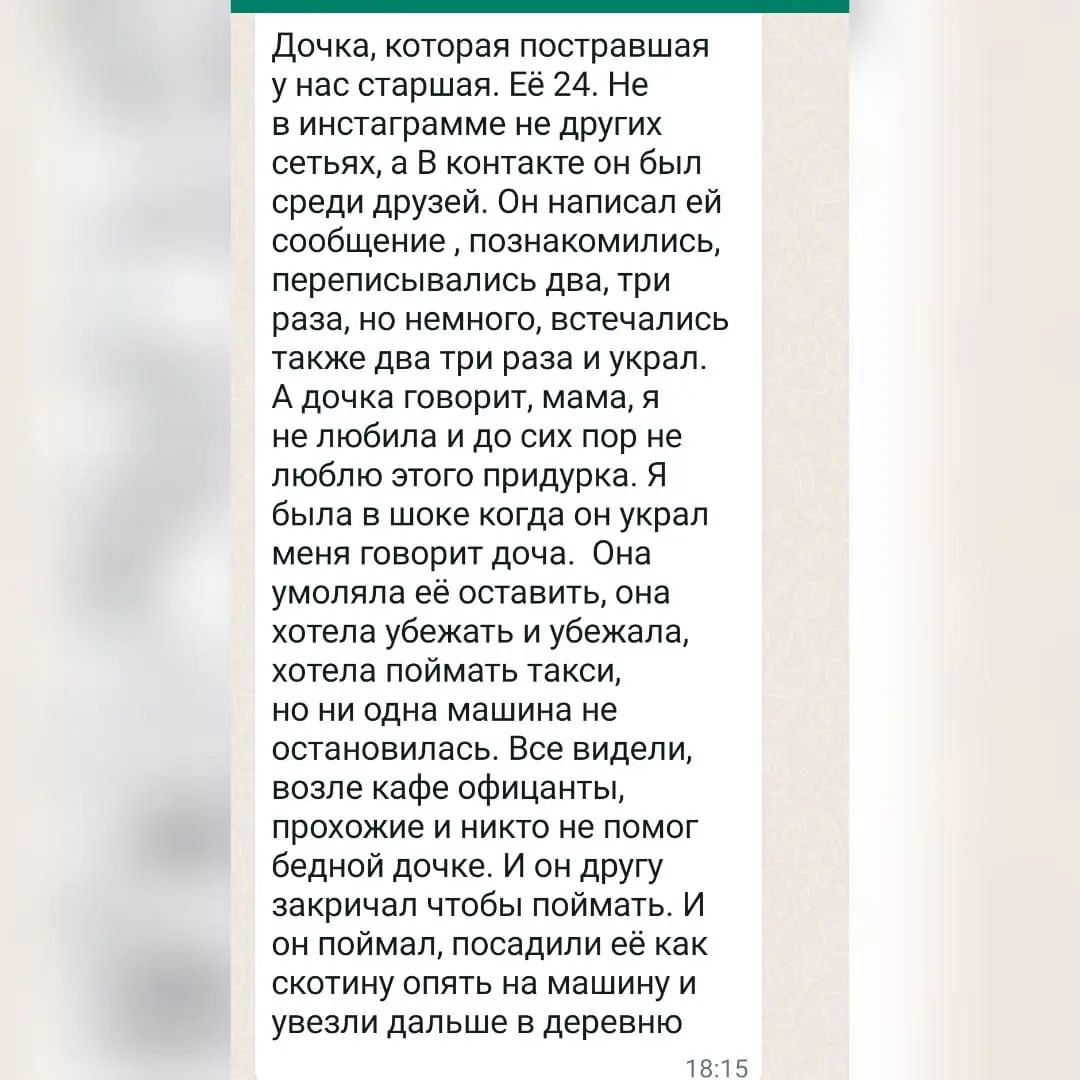 «28 мая похитил мою дочь мужчина. Ему под сорок, дочке — 24. Забрал ее телефон, чтобы она никому не звонила. Мы ее искали, рыдали и думали только о хорошем. Но, увы, она не пришла домой. Ее насильно забрали и увезли в какую-то деревню и держали ее там», — сообщила мама девушки.