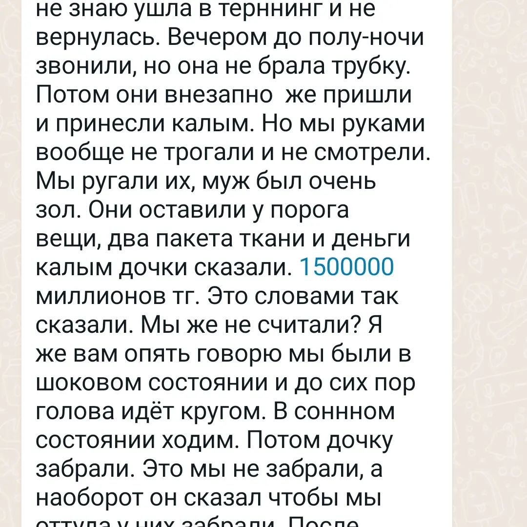 Эта семейка держит дочь взаперти в полной темноте, когда приезжают за девочкой, мужлан нагло пересчитывает свои деньги в темноте, у него сделка не состоялась! (Видео прилагаем) Он не боится, что его привлекут за похищение девушки в группе лиц, ему плевать, что изнасиловал за ночь трижды, сломал ее! Родители подают заявление, но дело не заводят. Следователь изымает белье у потерпевшей и держит его в своей тумбочке! Почему следователь взял на себя функции эксперта и судьи? Этот "жених" опасен, он, скорее всего, делает это не первый раз, есть еще пострадавшие», — комментирует историю похищения Дина Смаилова.