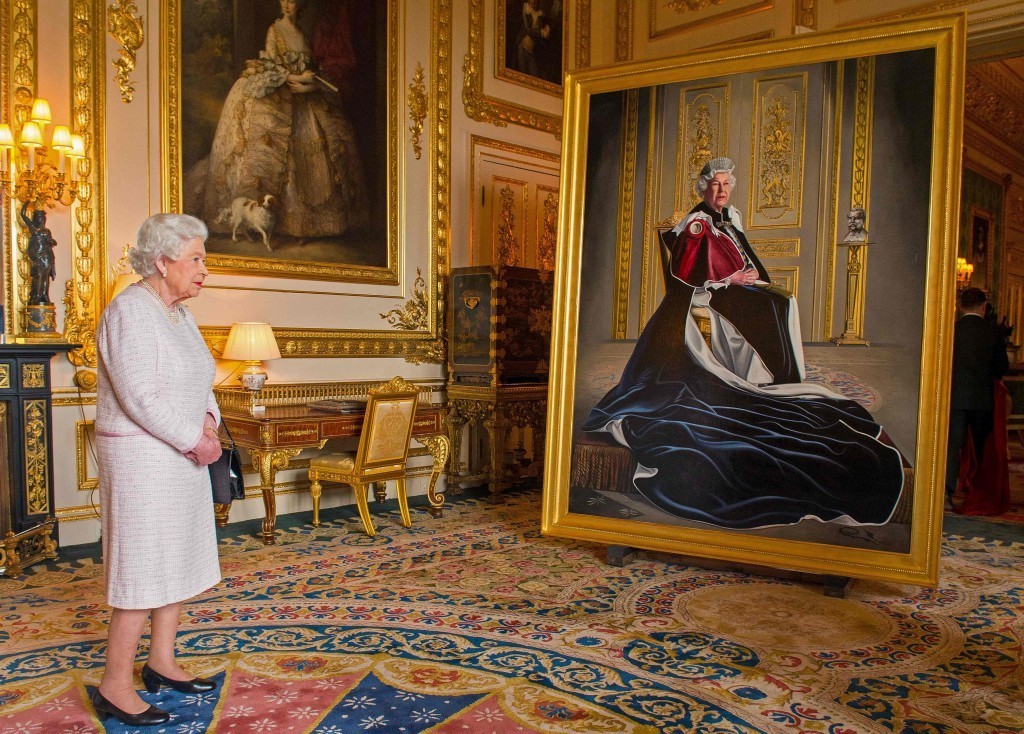 Королева Великобритании Елизавета II рассматривает свой портрет, написанный британским художником Генри Уордом, в честь ее шестидесятилетнего покровительства Британскому Красному Кресту. Лондон, Виндзорский замок.