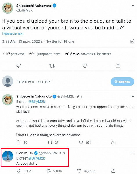 Вполне возможно, что в ближайшее время миллиардер все же раскроет какие-нибудь детали по этому вопросу. Вероятнее всего, если Маск действительно загрузил свой мозг в облако и теперь может разговаривать с виртуальным собой. Или даже проводить эксперименты над своим цифровым двойником.
