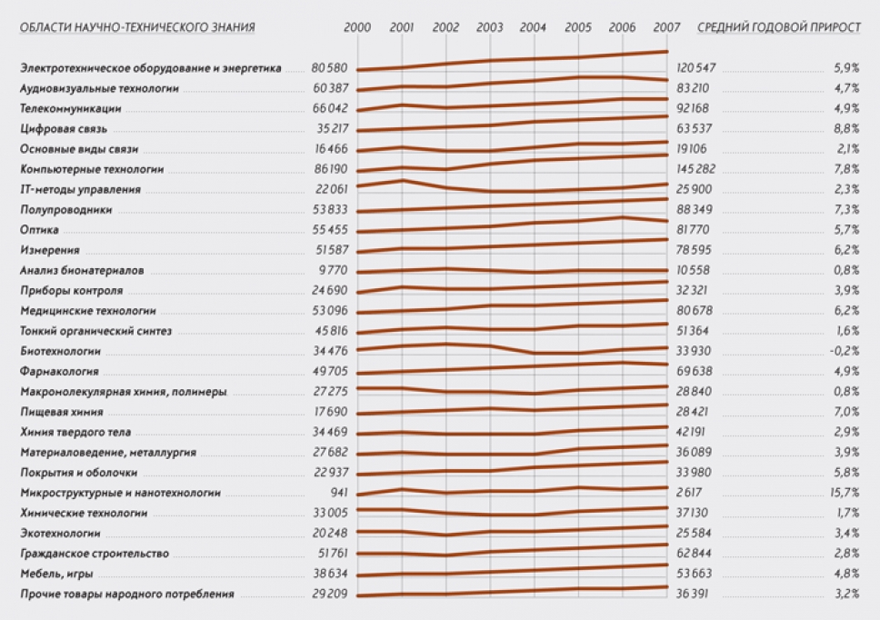 Ни одна территория не оставалась лидером производства знаний надолго, а инновации появляются не только в новых областях, но и в новых отраслях. Сегодня, как и 500 лет назад, во время книгопечатной революции, коммуникации растут с возрастающей отдачей, а транспорт — с уменьшающейся. Все больше усилий затрачивается на то, чтобы выжать из транспортных средств еще несколько километров на литр топлива, в то время как каждый следующий мегабит в секунду дается все проще.
