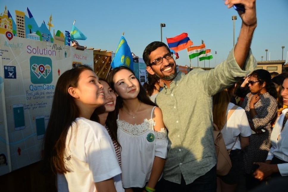 Аружан Кошкарова: Я читала биографию Сундара Пичаи в книге о самых влиятельных людях мира. Хотела узнать, как он добился такой высокой позиции. Меня очень вдохновила его история: родившись в Индии, он сумел перебраться в США и достигнуть самой что ни на есть вершины благодаря своему уму. Читая книгу, я и думать не думала, что встречу его в реальной жизни, да еще и сфотографируюсь. В Сан-Франциско кого ни спросишь – работает над стартапом, с кем ни познакомишься – работает в Microsoft или Google. Выходишь на улицу, садишься в такси Uber или Lyft, и там все водители – стартапперы. Поездка была очень полезной и запоминающейся в первую очередь из-за знакомств с новыми людьми, увлеченными тем же делом, что и ты.Наше совместное селфи облетело казахстанские СМИ и соцсети. Теперь люди подходят к нам и говорят: «Мы, конечно, не Сундар Пичаи, но можно с вами сфотографироваться?»