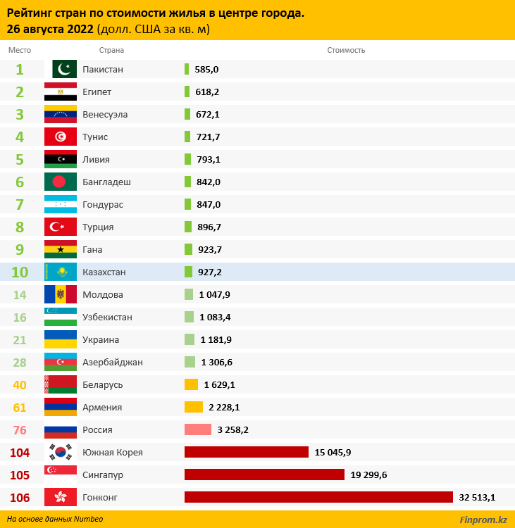Жилье в центре города обходится в РК в среднем в $927,2 за кв. м. Это 10-е место в рейтинге из 106 стран. Примечательно, что кроме РК в топ-10 стран не вошла ни одна страна СНГ. В целом самое дешевое жилье находилось в гораздо менее благополучных и развитых странах, чем наша республика. Так, топ-3 в секторе составили Пакистан ($585 за кв. м), Египет ($618,2) и Венесуэла ($672,1).