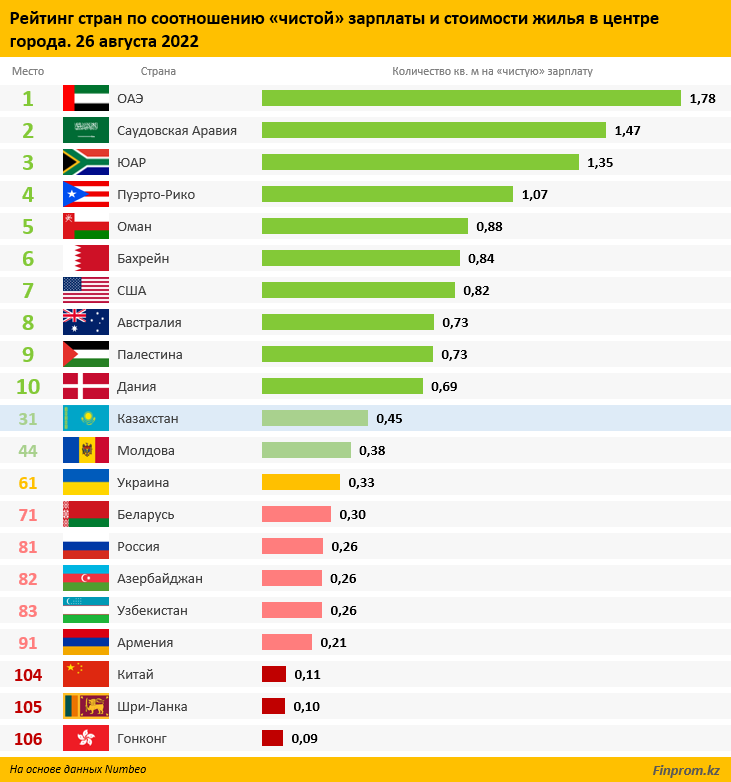Позиция РК оказалась лучшей среди всех стран СНГ. Так, Казахстан занимает 31-е место из 106: в республике на среднюю «чистую» зарплату можно приобрести в среднем 0,45 кв. м жилья в центре города. Близкие к казахстанским показатели (то есть порядка 0,5 кв. м на среднюю зарплату после уплаты налогов) наблюдаются в таких развитых странах, как, к примеру, Новая Зеландия, Великобритания, Испания, Финляндия, Канада, Швейцария и т. д.