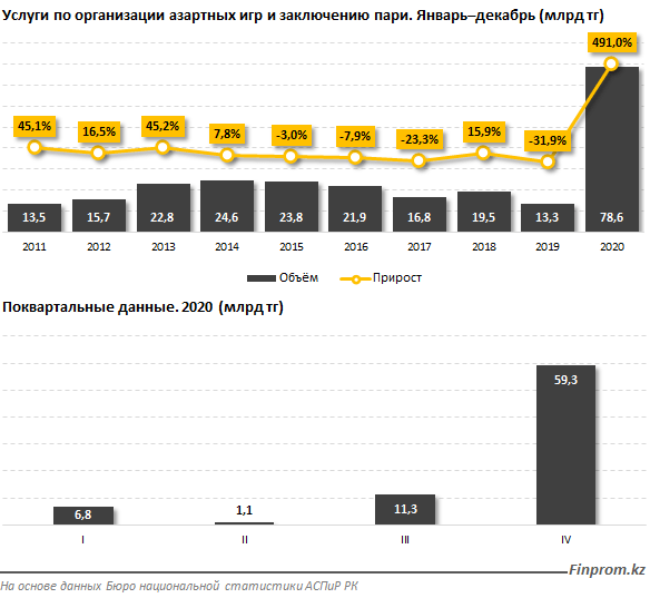 Объем услуг по организации азартных игр и заключению пари в скудном на культурные развлечения «коронавирусном» 2020 году составил рекордные 78,6 млрд тенге. Это почти в 6 раз больше по сравнению с 2019-м.