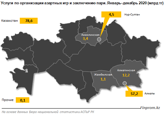 Значительные объемы услуг по организации азартных игр и заключению пари наблюдаются также в Акмолинской (3,4 млрд тг) и Жамбылской (1,1 млрд тг) областях. На пятёрку регионов-лидеров приходится 99,8% от всего объёма услуг в этой сфере.