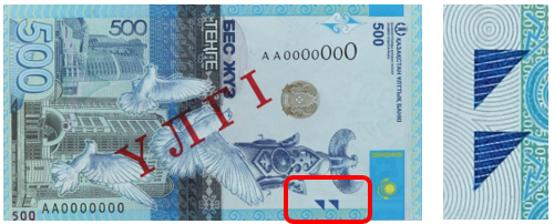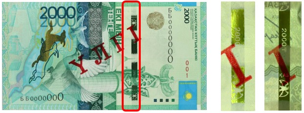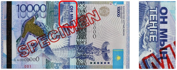 На банкнотах номиналом 1000, 2000, 5000, 10000 и 20000 тенге имеются изображения в виде рисунка, нанесенные цветопеременной краской. При изменении угла наклона банкноты цвет изображений меняется от зеленого до золотого.