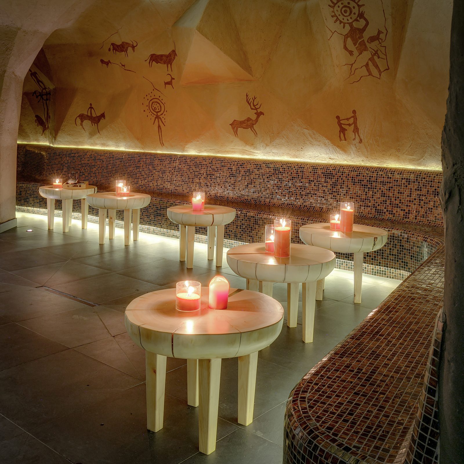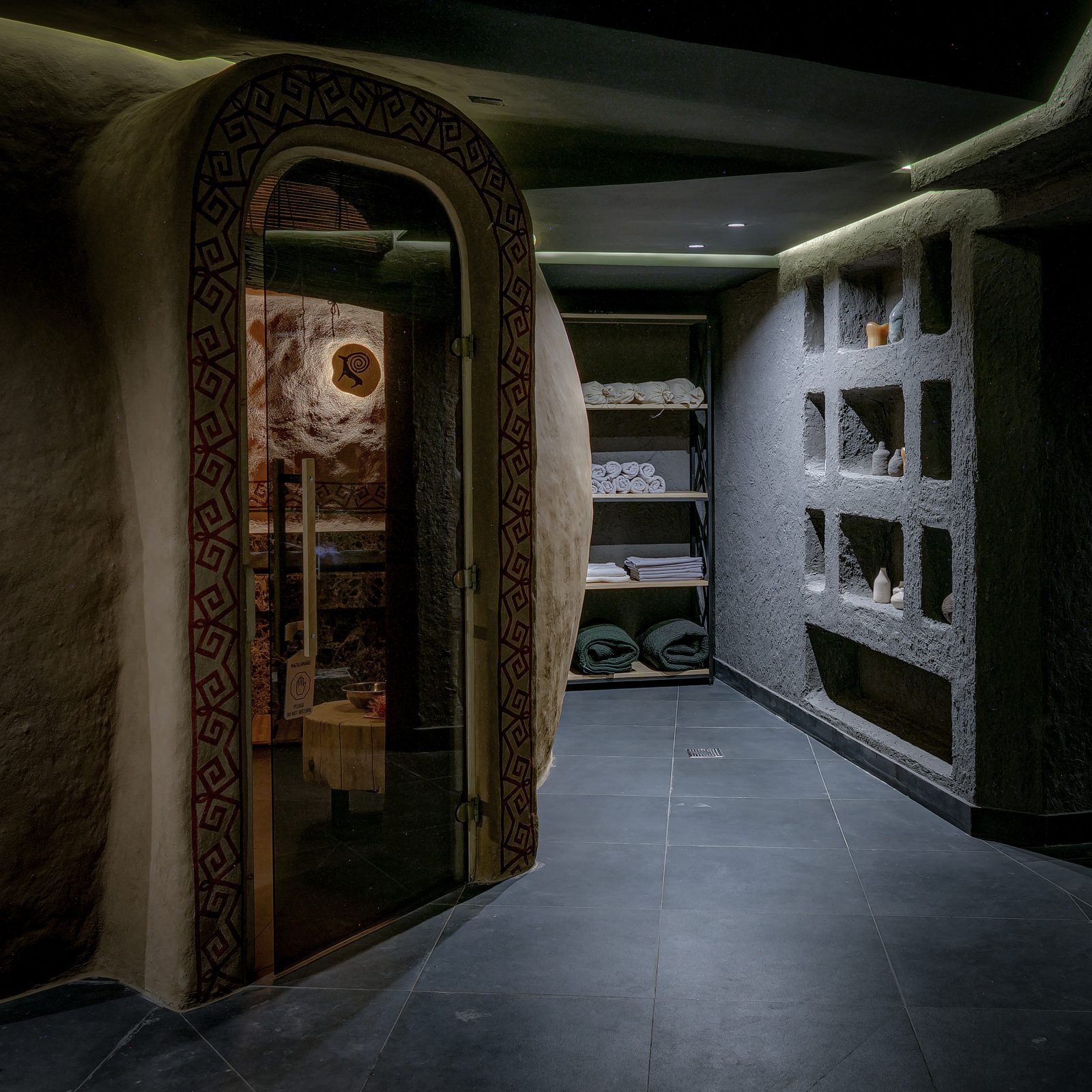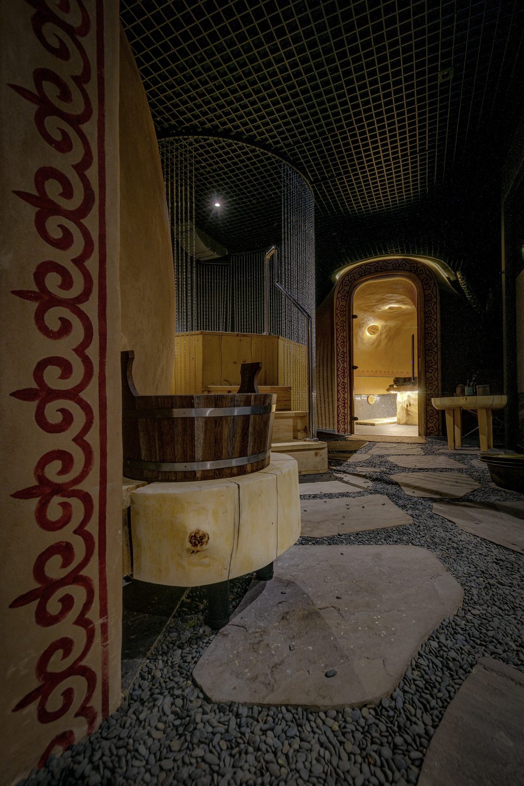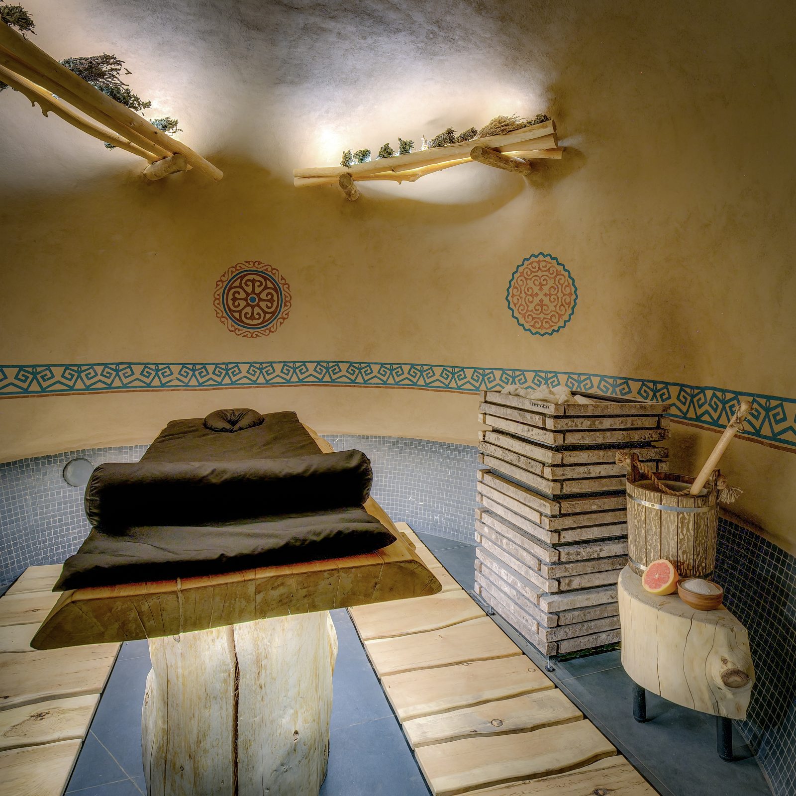 Владельцы спа поделились, что концепция заведения построена на любви к истории родного края и его природе.Еще в домонгольский период на территории Казахстана были распространены глиняные бани, идею которых получилось воплотить в современном спа. Вдохновение для создания дизайна спа, как не удивительно, было найдено на раскопках древнего городища Кайлык. Обломки его монументальных стен подсказали идею для фактур и цветов, древняя керамика возродилась в современной посуде и декоре, растения и травы нашли применение в отделке потолка и стен. Современные казахстанские художники бережно адаптировали орнаменты в роспись на стенах бань и зон отдыха.