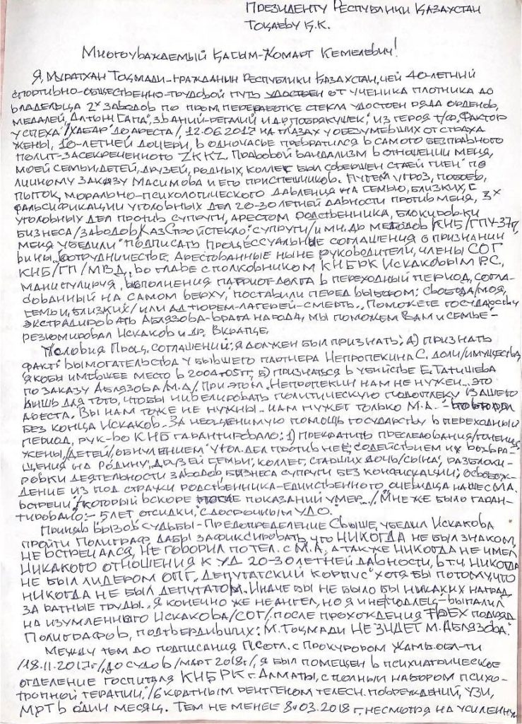 «Я, МуратханТокмади – гражданин Республики Казахстан, чей 40-летний спортивно-общественно-трудовой путь от ученика плотника до владельца двух заводов по промышленной переработке стекла удостоен ряда орденов, медалей, «Алтын Сапа», званий-регалий – из героя программы «Фактор успеха» на ТК «Хабар» (за неделю до ареста) 12 июля 2017 года на глазах у обезумевших от страха жены и 10-летней дочери в одночасье превратился в самого бесправного политзаключенного страны. «Правовой вандализм» в отношении меня, моей семьи, родных, коллег, друзей был совершен арестованными ныне членами следственно-оперативной межведомственной группы (СОГ) КНБ/МВД/ГП под руководством Карима Масимова», - говорится в письме Токмади на имя президента Касым-Жомарта Токаева.