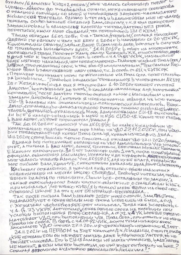 «После очередного ее письма в декабре 2020 года ГП ходатайствует о сокращении мне срока всего лишь на шесть месяцев, а суд Жезказгана в апреле 2021 года удовлетворяет этот минимум, тем самым оставляя мне минимальный срок 10 лет и вновь нарушая главное условие подписанного ПС! 24 ноября 2021 года на первом за 5 лет краткосрочном свидании, моя супруга со страхом сообщила: «КНБ передали, если ты не будешь молчать даже в одиночке, то не выйдешь никогда! Его в СИ-18 не могли угомонить, ад лагеря не успокоил, то что от него ожидать на воле?!» Все мои обращения администрация учреждения 159/25 Жезказгана игнорировала, за попытки отправить письма вам я дважды был направлен на неделю в карцер, письма домой, в госорганы, депутатам блокировались. Поэтому во время первого за пять лет длительного свидания в феврале этого года мы с супругой решили обратиться к вам, господин президент, через это открытое письмо», - сообщил бизнесмен.
