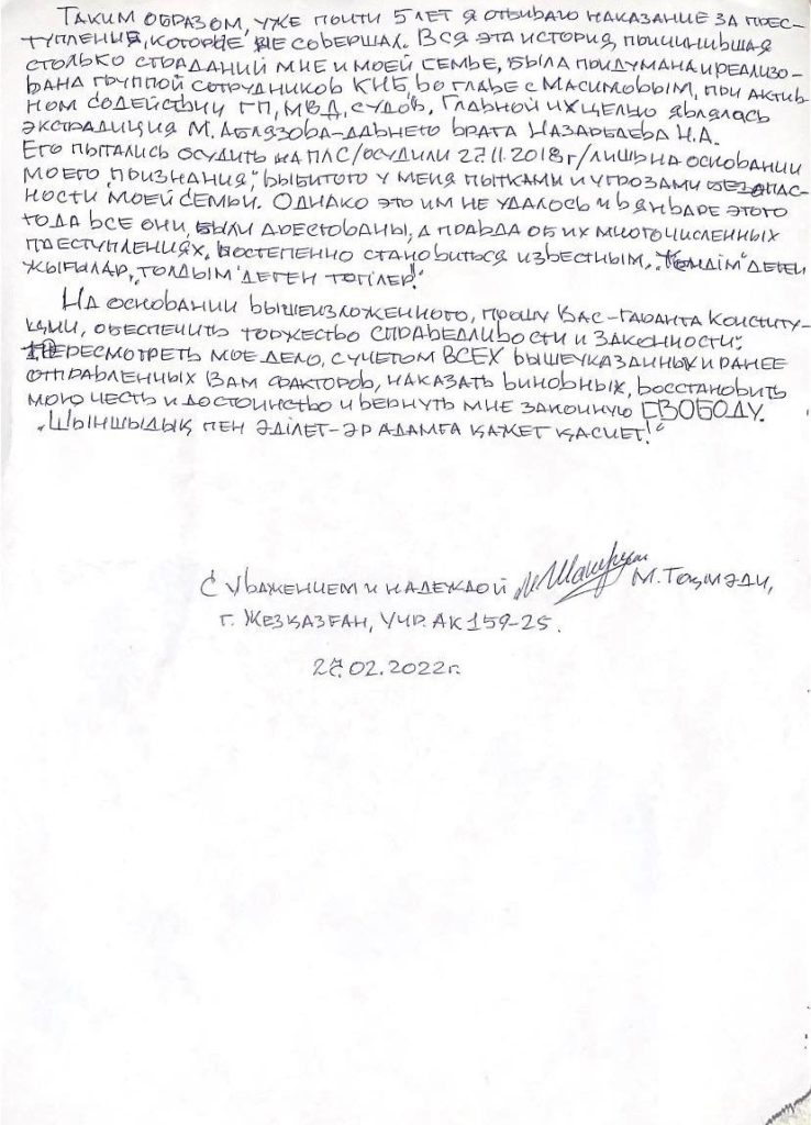 «Вся эта история, причинившая столько страданий мне и моим близким, была придумана и реализована группой сотрудников КНБ во главе с Масимовым при активном содействии ГП, МВД, судов. Главной их целью являлась экстрадиция Мухтара Аблязова – главного врага Н. Назарбаева. Однако это им не удалось, и в январе этого года все они были арестованы, а правда об их многочисленных преступлениях постепенно становится известна. На основании вышеизложенного прошу вас – гаранта Конституции, обеспечить торжество справедливости и законности, пересмотреть мое дело с учетом вышеуказанных и ранее отправленных вам факторов, наказать виновных, восстановить мои честь и достоинство и вернуть мне законную свободу! «Шыншыдық пен әділет – әр адамға қажет қасиет!» - заключил Токмади.
