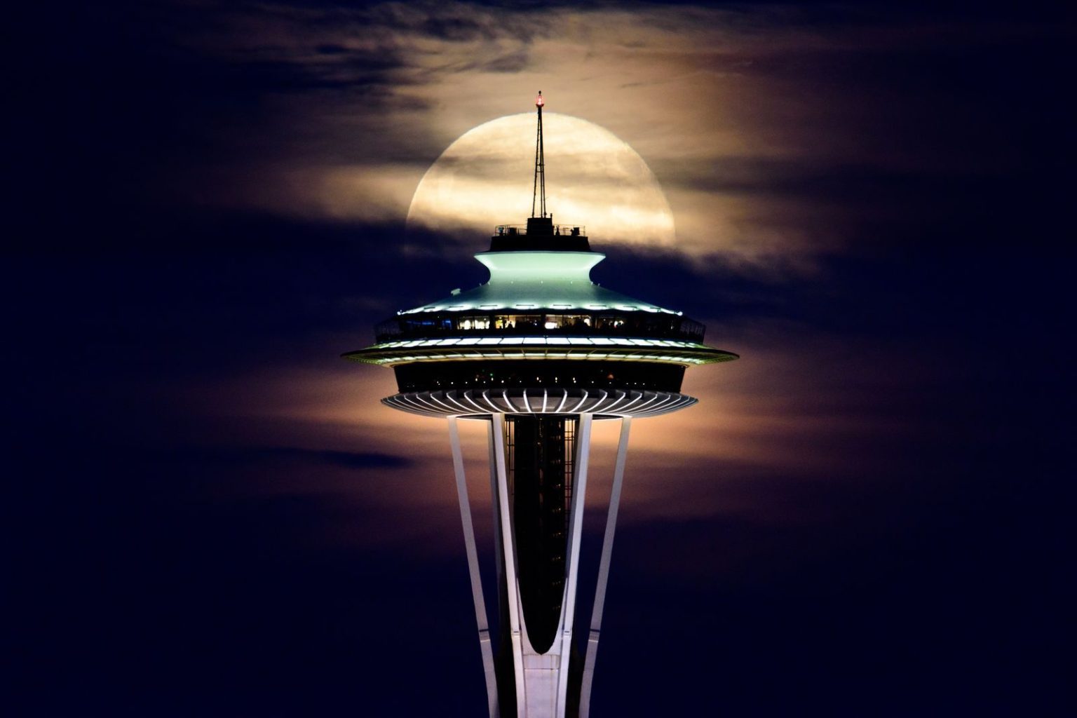 Полная луна поднялась сразу после захода солнца над Спейс-Нидл. Сиэтл, США.