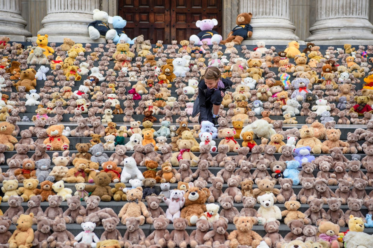 Девочка смотрит на 700 плюшевых медведей, размещенных на ступеньках собора Святого Павла международным агентством по оказанию помощи World Vision UK, олицетворяющих собой количество детей в неделю, которые становятся беженцами из-за конфликта в Южном Судане. Лондон, Англия.