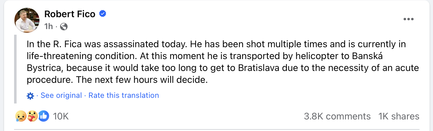 Как передает агентство Reuters, жизнь премьера в опасности, об этом также сообщила и пресс-служба правительства Словакии в пресс-релизе, разосланном по электронной почте.