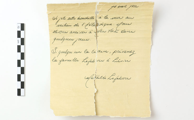 «Я бросаю эту бутылку в море посреди Атлантики. Мы должны прибыть в Нью-Йорк через несколько дней. Если кто-нибудь найдёт её, сообщите об этом семье Лефевров в Левен», – говорится в письме.