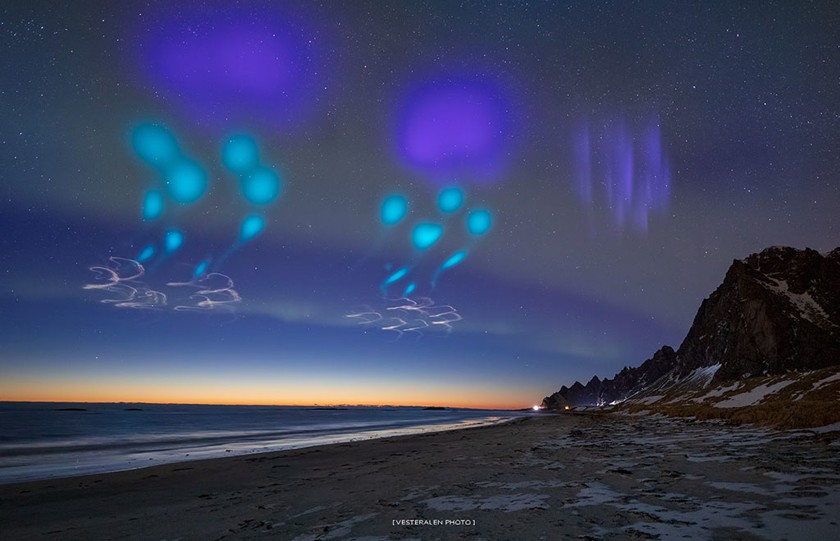Вечером 5 апреля жители Норвегии наблюдали уникальное зрелище – цепочки ярко-зеленых пятен на фоне северного сияния, находившиеся в небе в течение получаса.  [caption id="attachment_38919" align="aligncenter" width="840"]NASA AZURE эксперимент наука космос полярное сияние Норвегия астрономы ученые исследование небо звезды Фото: NASA[/caption] Такой эффект был достигнут с помощью запущенных с территории космического центра Андоя в Норвегии геофизических ракет в рамках проекта NASA AZURE. На высоте от 100 до 250 километров они распылили вещества-маркеры: частицы триметилалюминия, бария и стронция, которые позволят ученым исследовать поведение заряженных частиц в ионосфере, где возникают полярные сияния. Эксперимент AZURE (Auroral Zone Upwelling Rocket Experiment) ставит своей целью измерить параметры вертикальных потоков воздуха в ионосфере. Всего запланировано восемь пусков геофизических ракет на высоту до 250 километров. Полученные измерения призваны помочь ученым изучить процессы формирования полярного сияния с помощью рассеивания облака аэрозолей прямо на месте и наблюдения за поведением частиц с земли. За поведением распыленных частиц наблюдают астрономы из обсерватории Аломар на севере Норвегии.