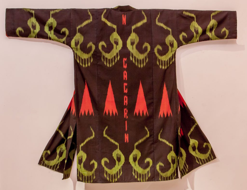 К примеру, казахстанка Бахыт Бубиканова рисует орнаменты на «тетрадном листке», а художница Диляра Каипова наносит их на традиционные узбекские халаты. Причем, украшает она их символами из современной популярной культуры – Микки Маусами, лого Капитана Америки, масками Крик. «Легко узнаваемые попсовые изображения «вплетаются» в абровые ткани и халаты и являются яркими высказываниями о глобализации и ее влиянии на ценности и национальную идентичность», - поясняют кураторы.