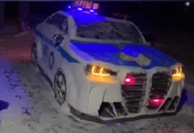 Кто-то лепит снеговиков, а кто-то предпочитает что-нибудь помасштабнее. Житель Уральска из снега слепил полицейскую машину размером с настоящий автомобиль.