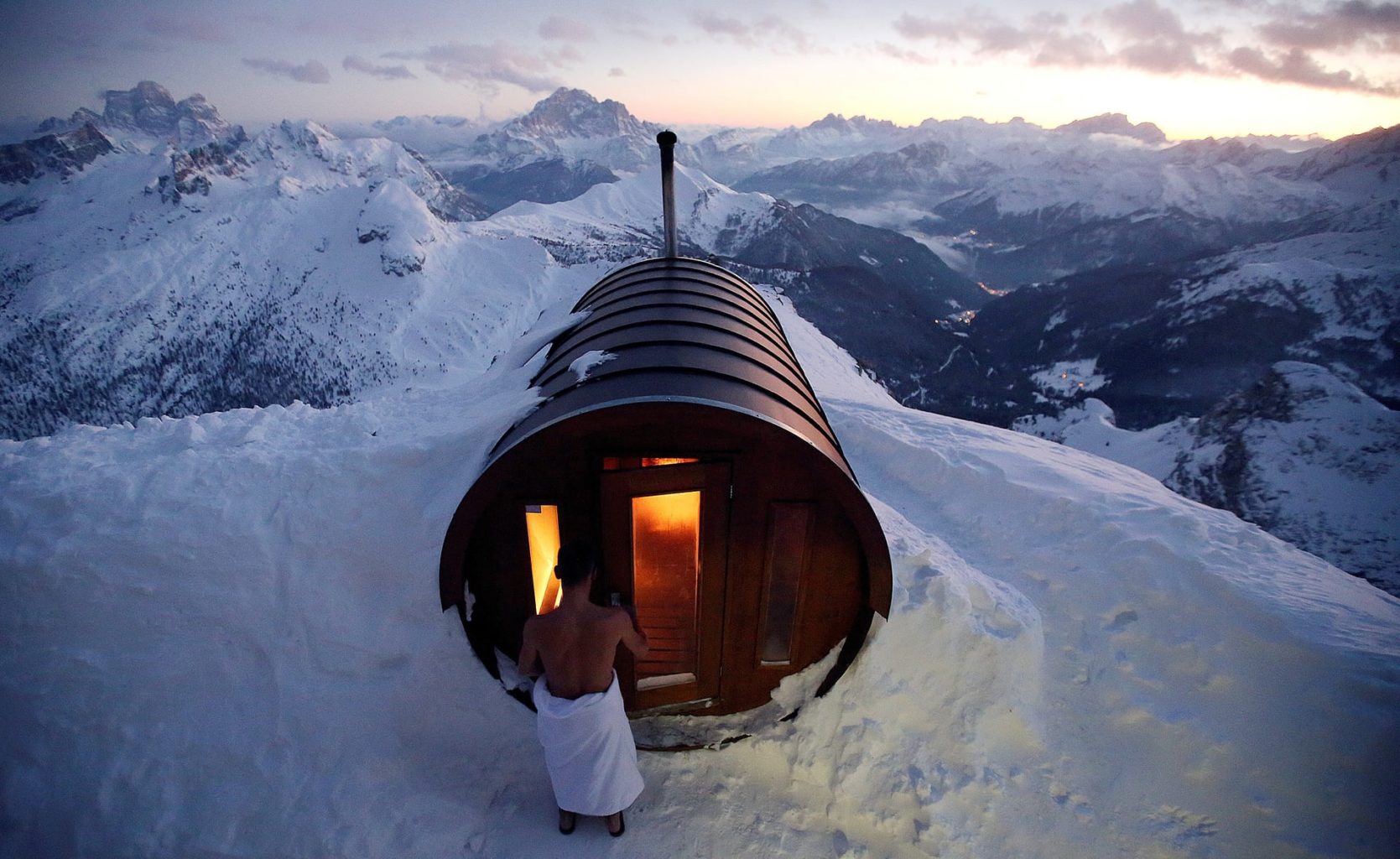 Мужчина открывает дверь в сауну, которая находится на вершине горы Лагацои. Д'ампеццо, Италия