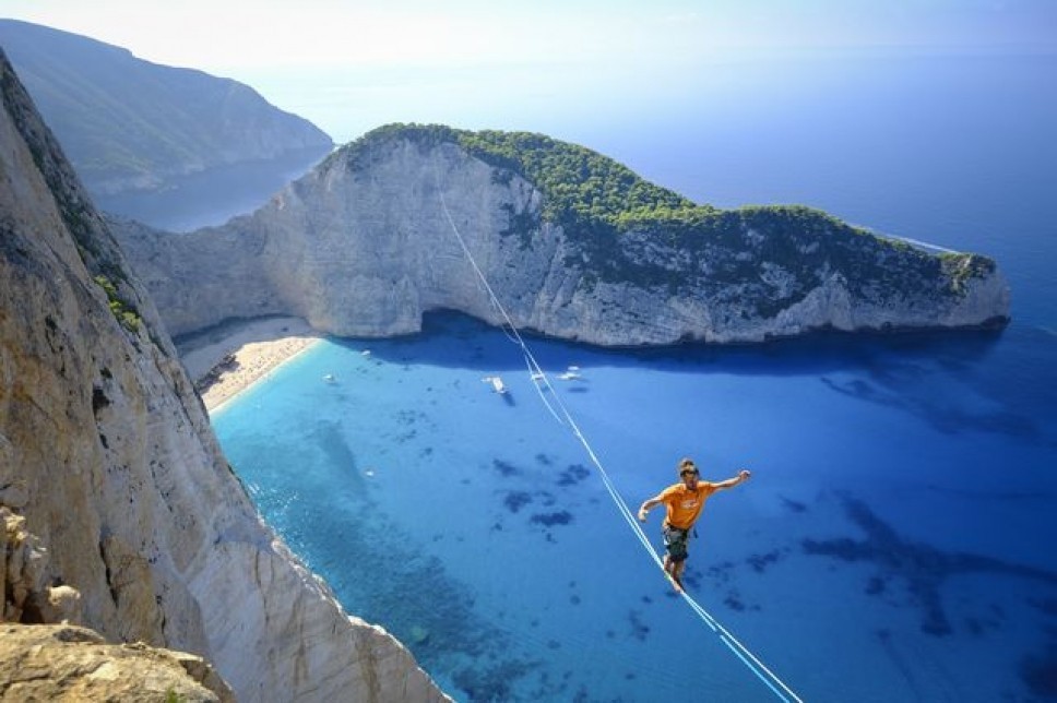 Слэклайнер идет по тропе, натянутой над пляжем Навайо. Закинф, Греция.