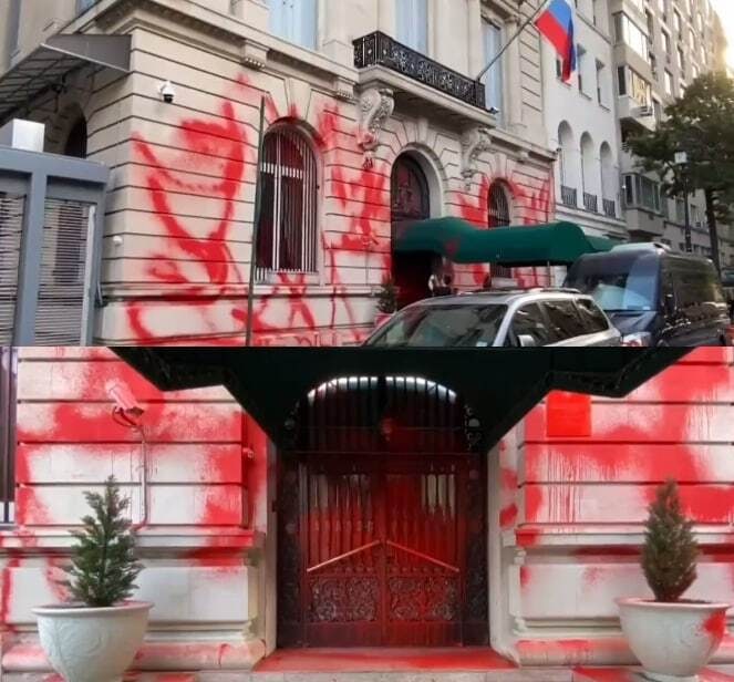 Ночью 30 сентября двое неизвестных облили краской фасад генерального консульства России, расположенное в районе Верхний Ист-Сайд.