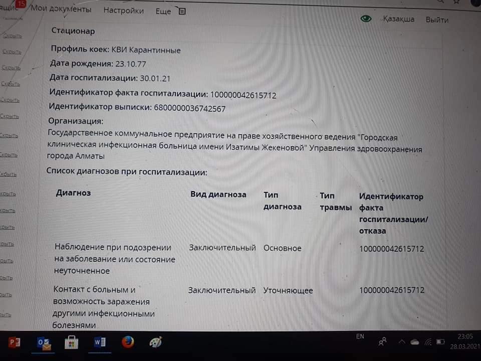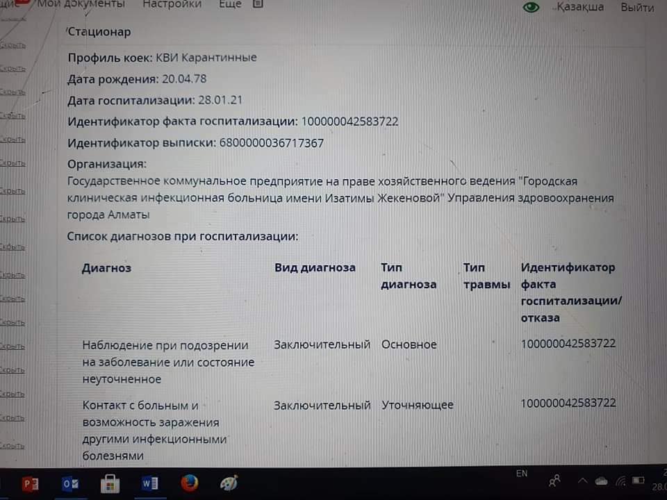 «Друзья, проверьте в своем личном кабинете еgov.kz. Вчера кто-то в сети написал, что ему прописали COVID, хотя он не болел, тест не сдавал. Подумали с женой: надо проверить. И что бы вы думали? Оказывается, мы с ней оба лежали в больнице с ковидом. Представляете? Только я якобы 28 января был госпитализирован, а она - 30 января. Есть идентификационный номер госпитализации и выписки. Причем мы точно знаем, что за неделю до этого сдавали тест и у обоих был отрицательный», - написал он в Facebook.