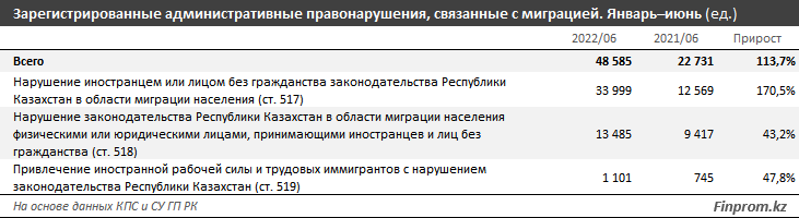 Несмотря на значительное уменьшение количества уголовных правонарушений по организации незаконной миграции, число административных правонарушений по итогам первого полугодия выросло сразу в 2,1 раза за год, до 48,6 тыс. случаев.