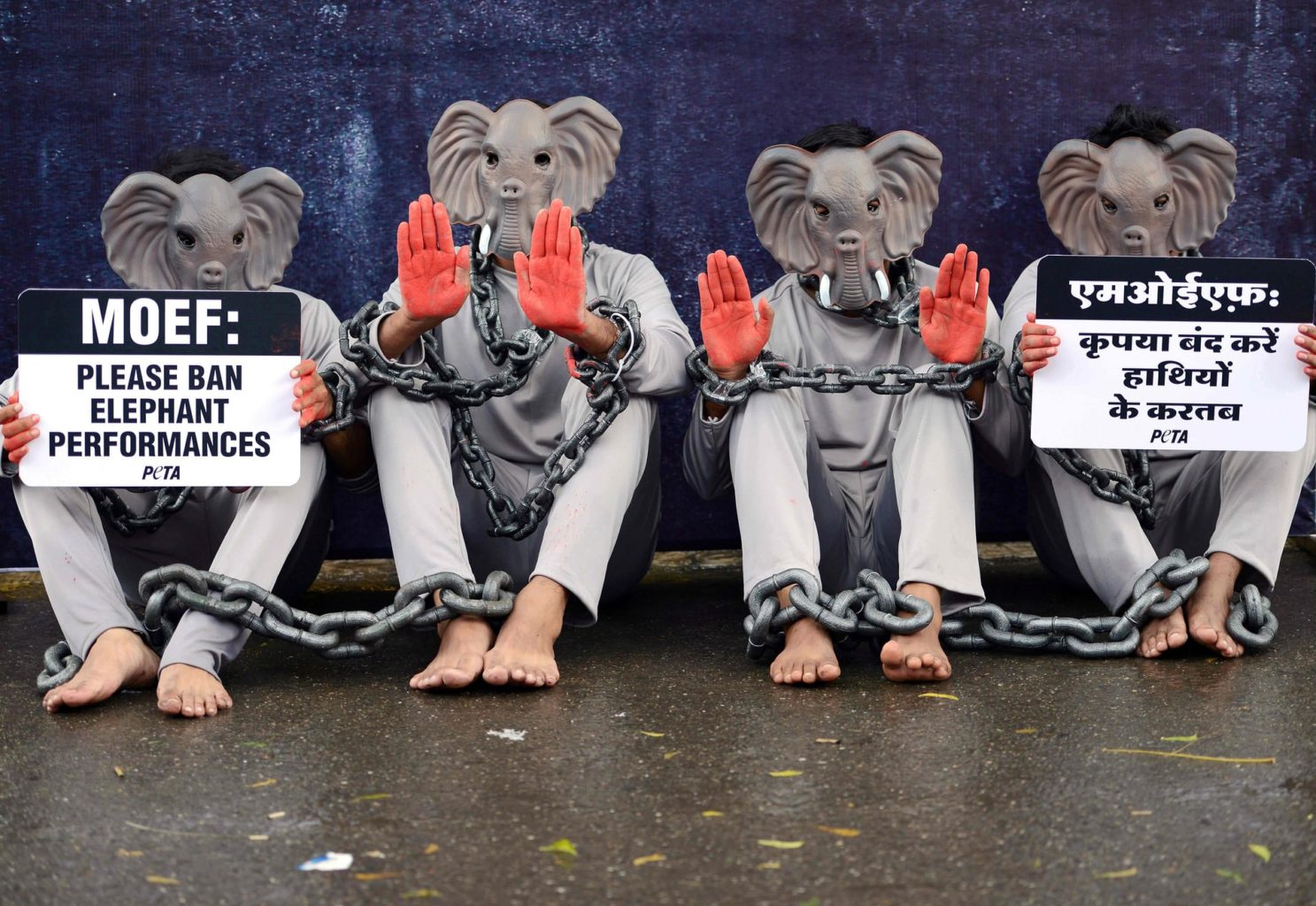 Индийские добровольцы группы по защите прав животных Пета во время протеста против использования слонов в качестве развлечений. Нью-Дели, Индия. Источник