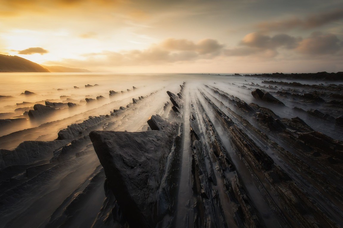 Туман окружает острые углы глинистого песчаника на побережье Басков, Испания.
