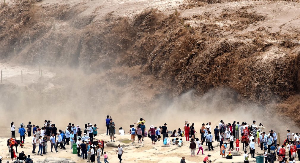 Посетители водопада Хуанхэ на Желтой реке на северо-западе Китая. Желтая река, Китай.