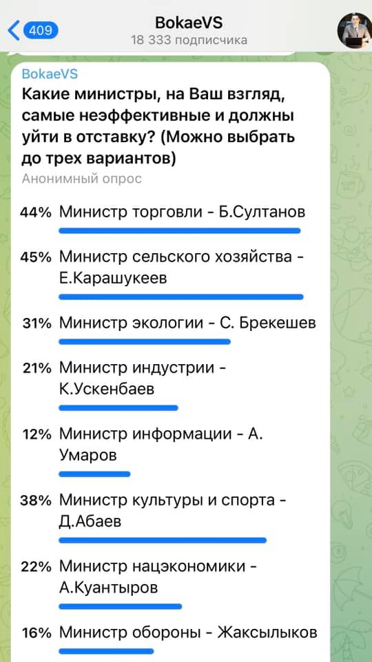 Известный казахстанский политолог Санжар Бокаев провел опрос среди своих подписчиков на тему, кому из министров, на их взгляд, пора покинуть свой пост.