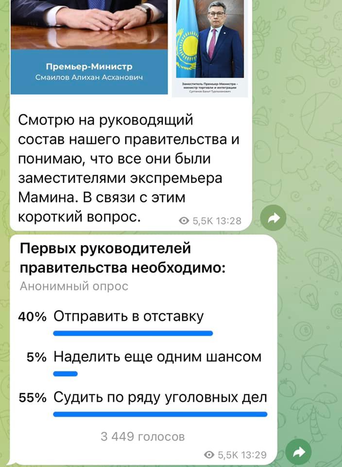 «При этом 40% респондентов ответили, что весь руководящий состав правительства должен уйти в отставку. Еще 55% высказались за открытие уголовных дел в отношении первых руководителей правительства», – уточнил Бокаев.