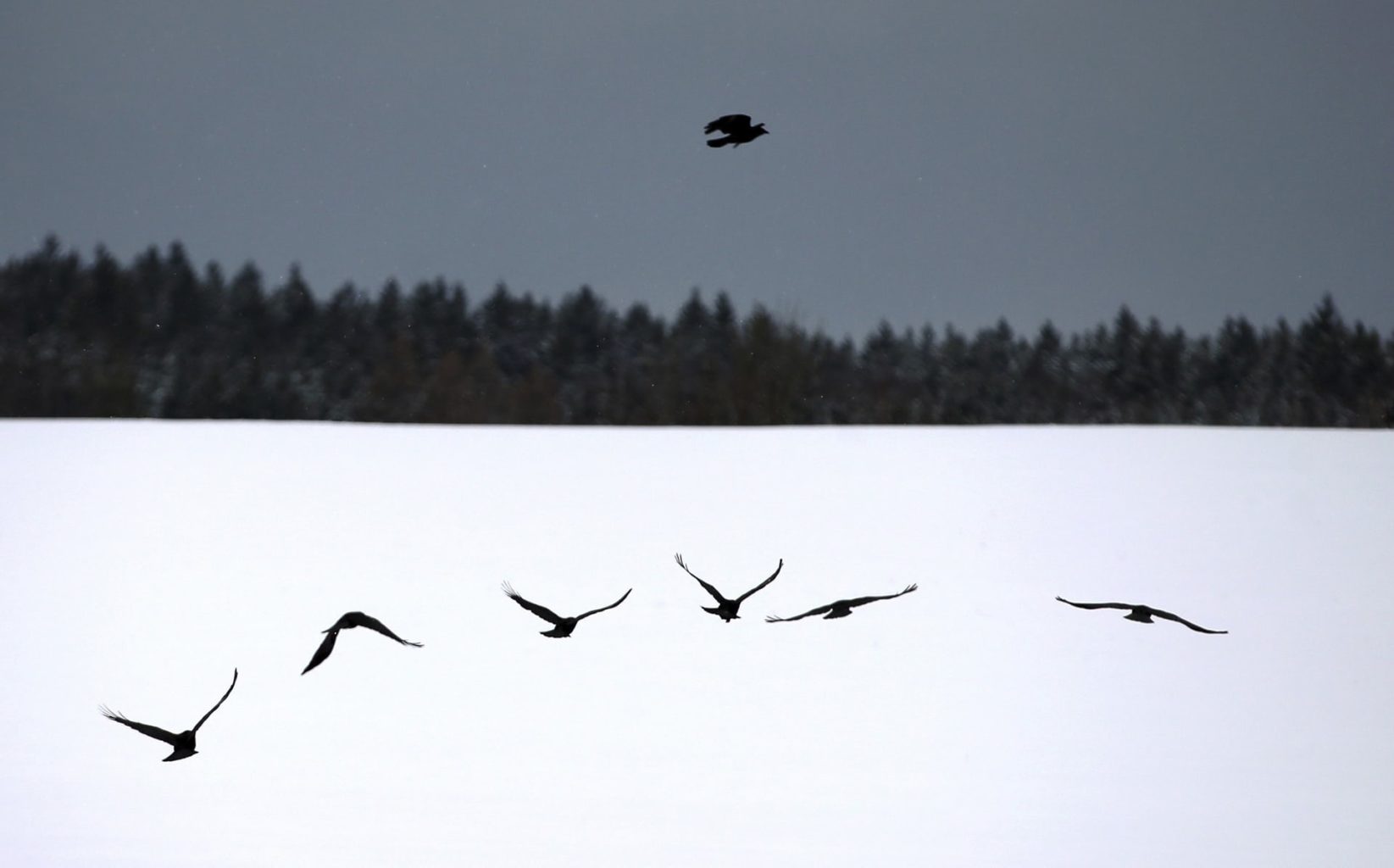 Вороны пролетают над заснеженным полем.