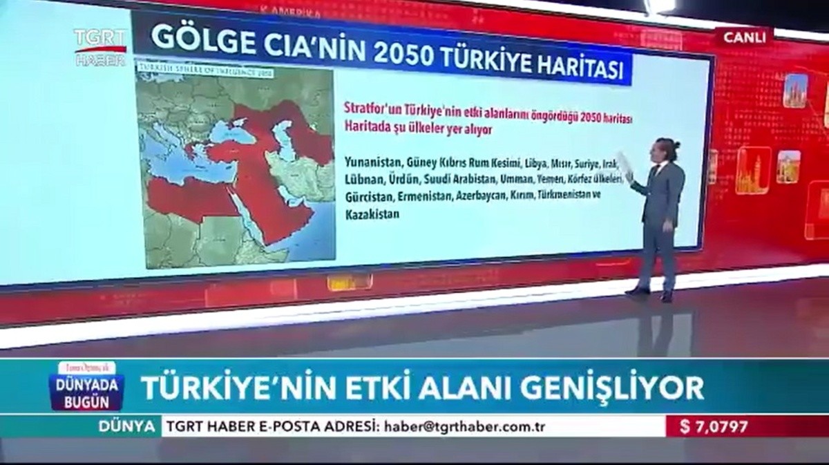 Турецкий государственный телеканал TRT1 показал в эфире прогноз относительно расширения сфер влияния Анкары, подготовленный ранее американской компанией Stratfor. Внимание на кадры обратил Telegram-канал «Военный обозреватель».