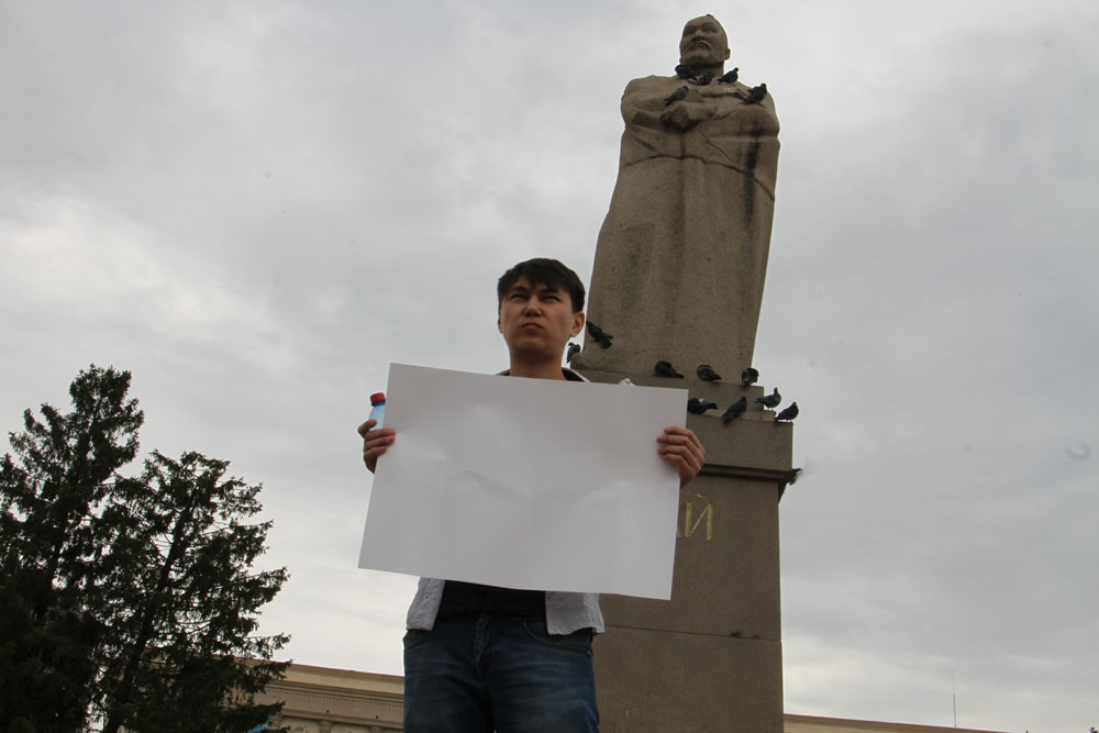 Аслан Сагудинов вышел на площадь перед памятником Абая рядом с местным акиматом с пустым плакатом, чтобы доказать, что в Казахстане нет свободы слова.