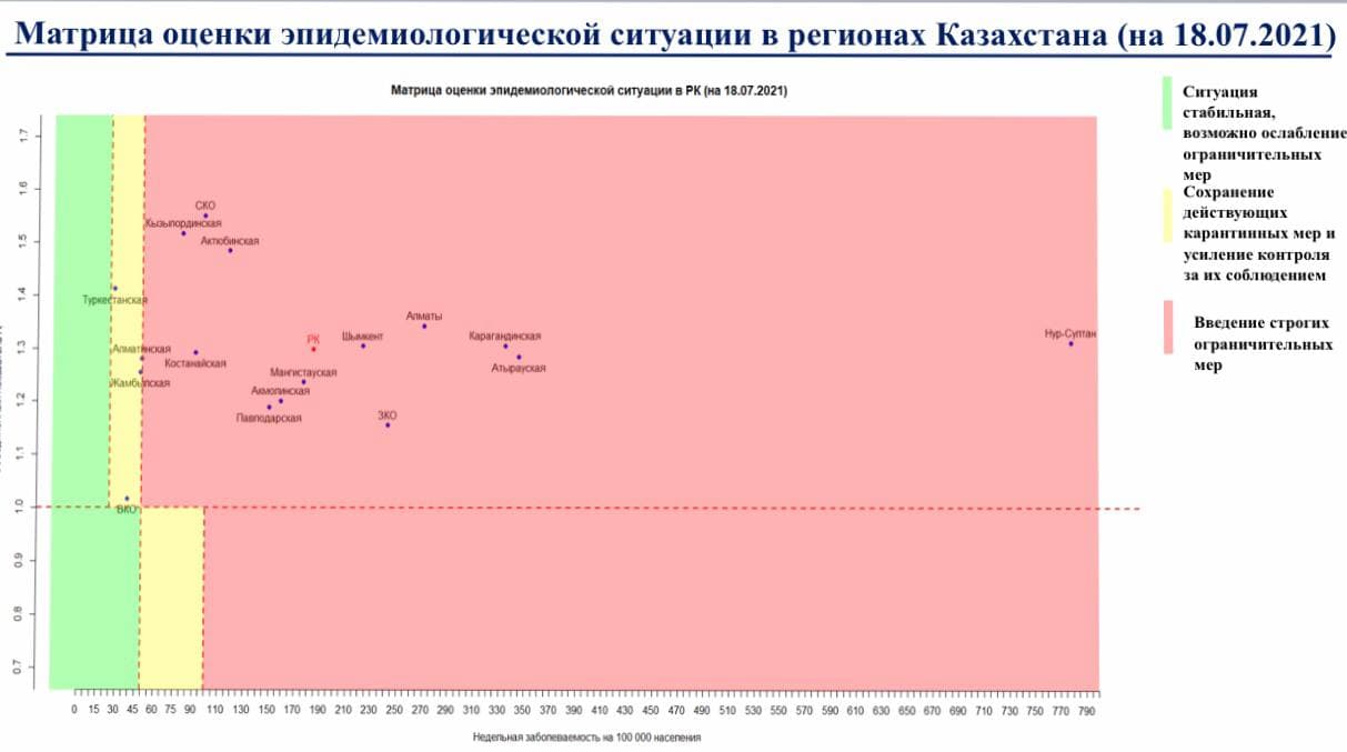 Теперь, согласно матрице оценки эпидемиологической ситуации в регионах Казахстана, в «красной» зоне находятся Нур-Султан, Алматы, Шымкент, Акмолинская, Актюбинская, Атырауская, Западно-Казахстанская, Карагандинская, Костанайская, Кызылординская, Мангистауская, Павлодарская, Северо-Казахстанская области.