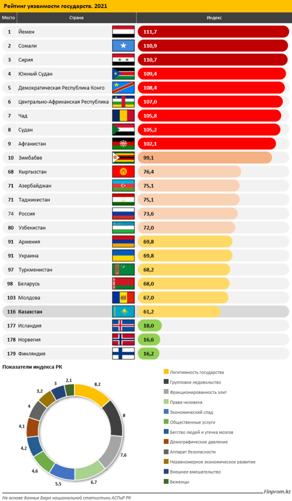 Наиболее высокие (а значит, плохие) оценки у РК наблюдаются по таким показателям, как легитимность государства (8,2 балла), групповое недовольство (8 баллов) и фракционированность элит (7,6 балла). Как поясняет Finprom, индикатор фракционированности элит учитывает разделение и раздробленность государственных институтов по этническим, классовым, клановым, расовым или религиозным признакам.