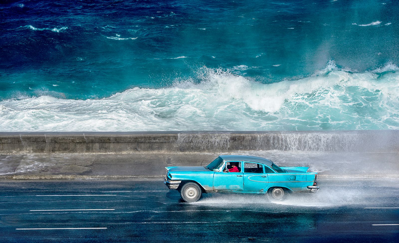 Ретро-автомобиль проезжает вдоль Малекона, пятимильной проезжей части вдоль побережья. Гавана, Куба. Источник