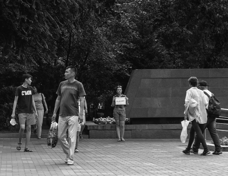 Люди, которые шли мимо, в большинстве своем видели во мне информационный шум и вовсе не обращали внимания. Кто-то непонимающе всматривался в надпись «Я Денис», компания экспатов задорно улыбалась. Один прохожий спросил: «Вы кого-то потеряли?» Я отрицательно помотала головой. Другой усмехнулся: «Девушка, это что за прикол?» «Вы знаете, кто такой Денис Тен?» – спросила я в ответ. Он закивал и поспешил уйти, как мне показалось, немного стыдливо.