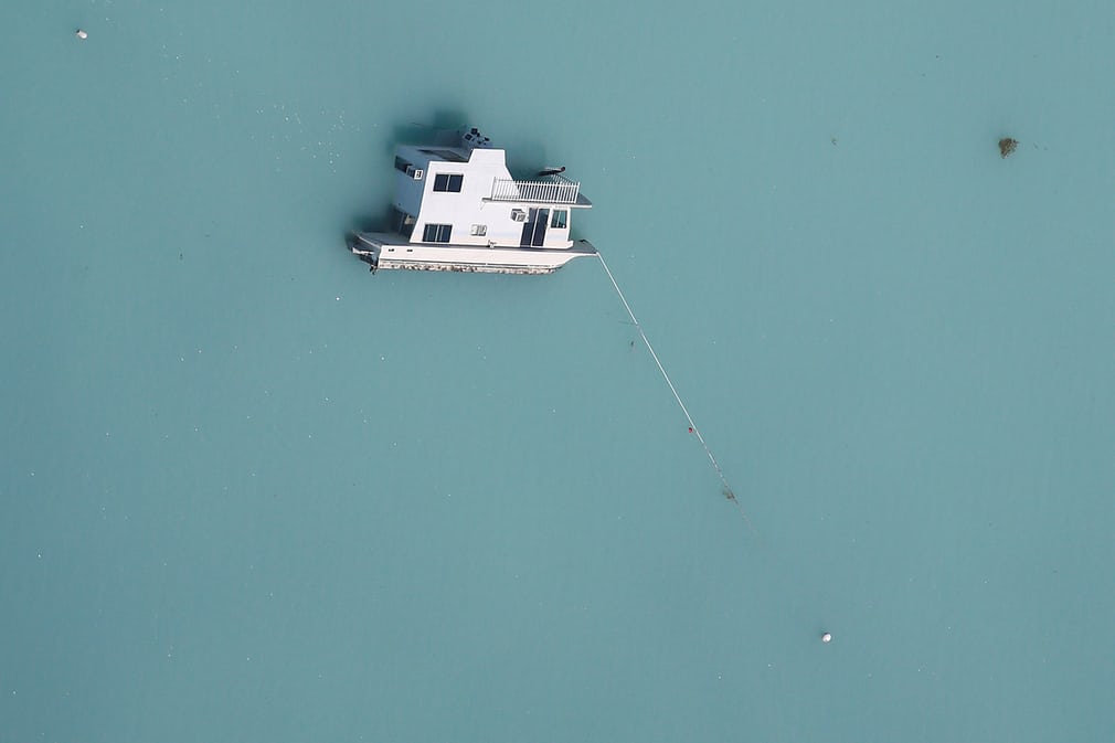 Перевернутая лодка плавает во Флорида-Кис после урагана Ирма. Марафон, США.